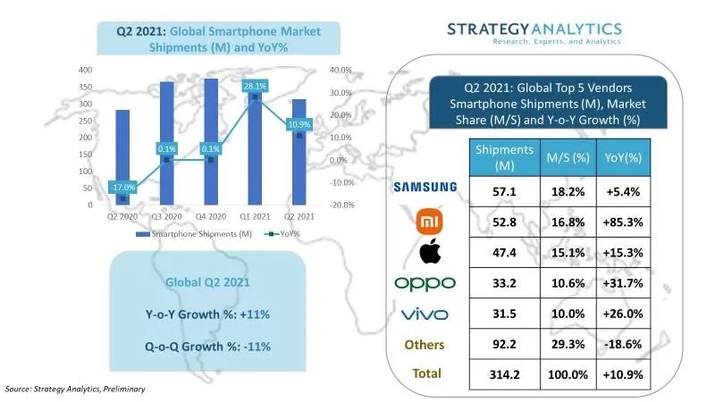 Strategy Analytics最新发布的研究报告指出,2021年Q2全球智能手机出货量同比增加11%,到达3.142亿部。这是近年来第二高的年增加率(仅次于2021年Q1的 28%)。但是,全球智能手机出货量季度环比下降11%,首要因为印度和东南亚国家的第二波COVID-19疫情以及供给约束。
