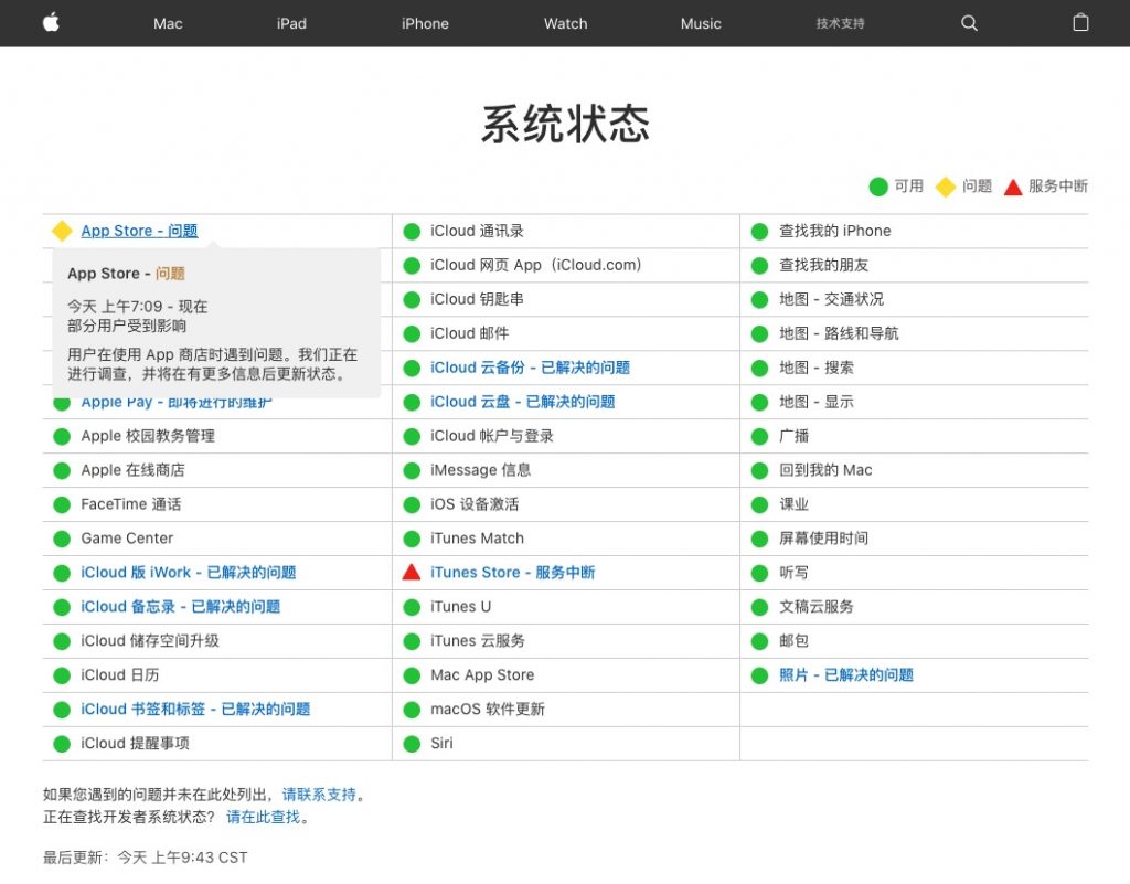 页面显现,App Store 处于正常状况,不过后来这一状况变为“问题”,显现今日上午 7:09 到现在有部分用户运用 App Store 时“遇到问题”,苹果表明“正在进行查询,并将在有更多信息后更新状况。”