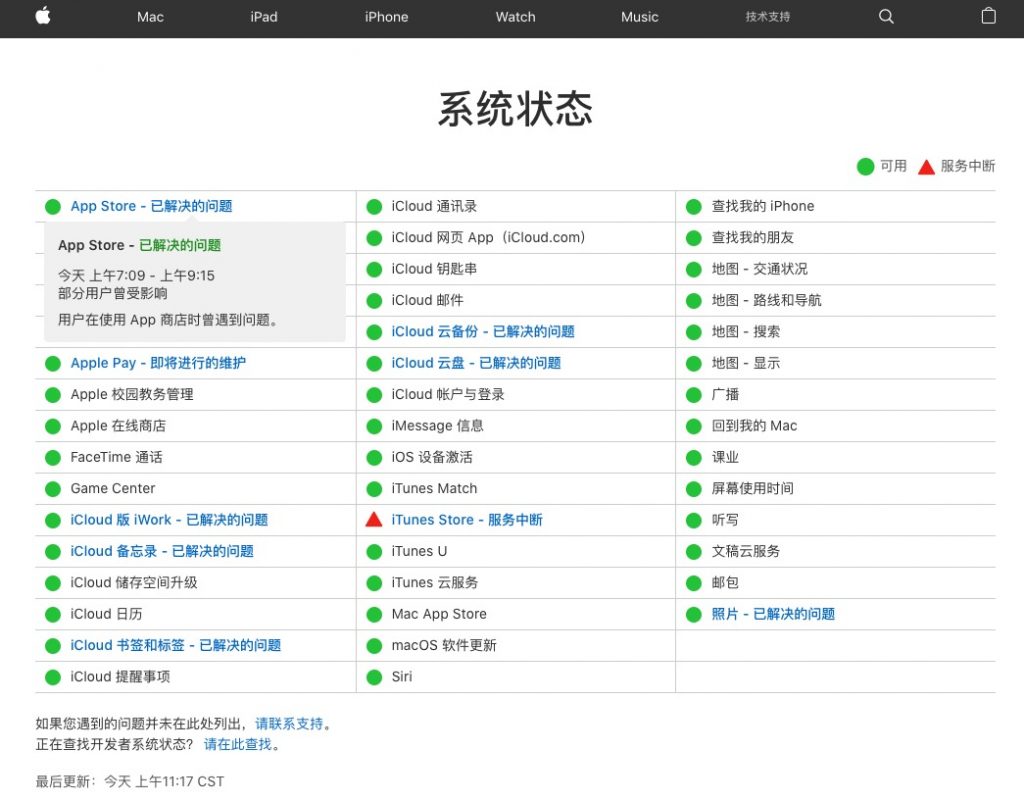 苹果官网“体系状况”页面显现,用户今早遇到的问题“已处理”,信息显现今日上午 7:09 到 9:15 有“部分用户曾受影响”,“用户在运用 app 商铺时曾遇到问题。”除此之外没有给出有关“问题”产生的原因和处理方法等更多阐明。