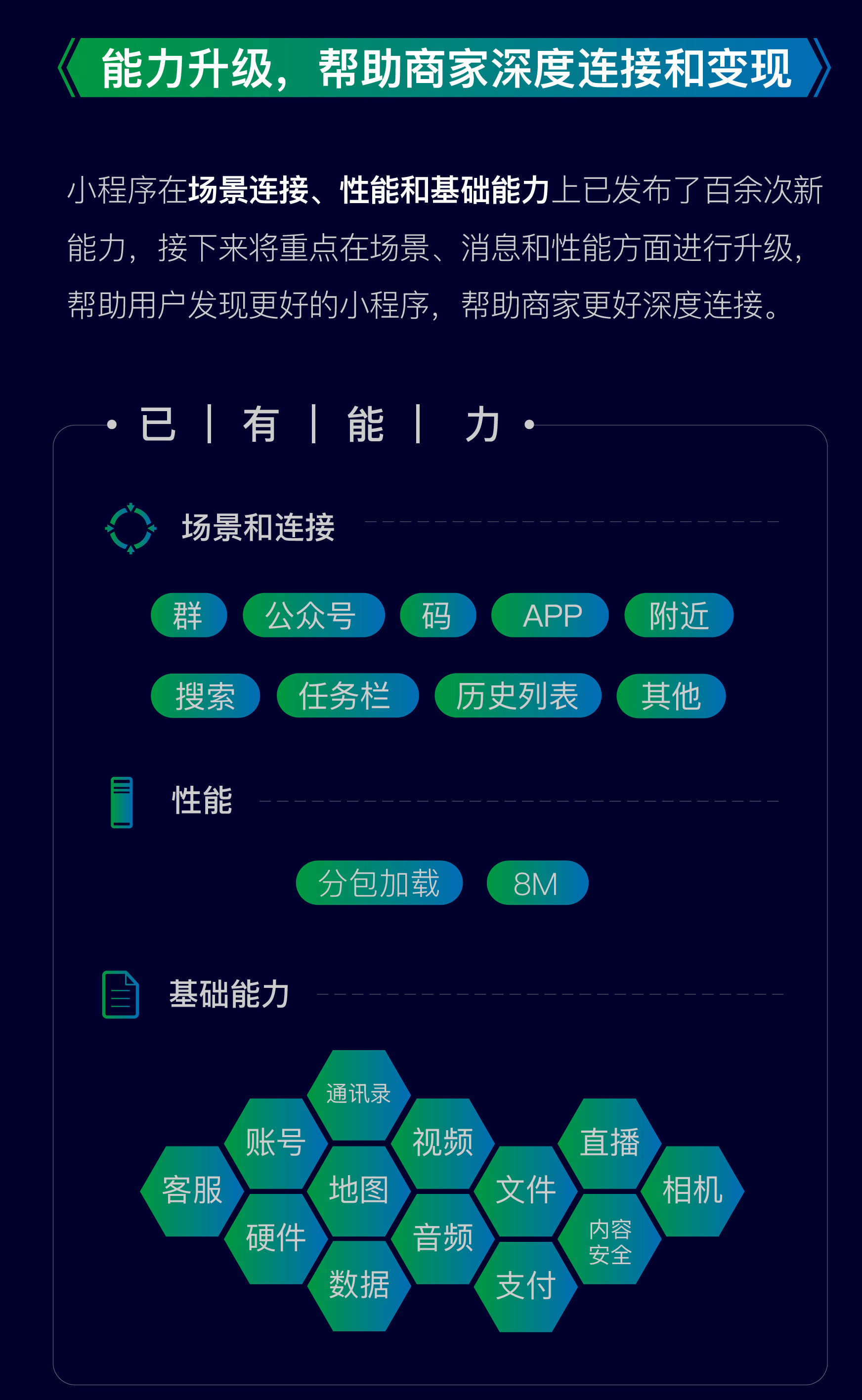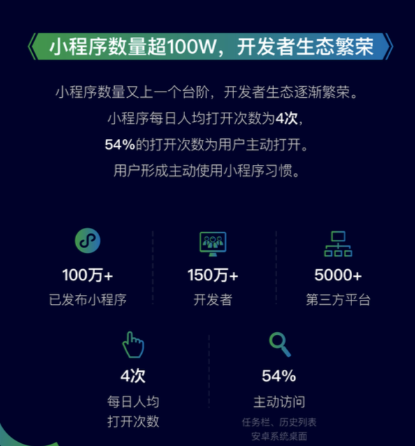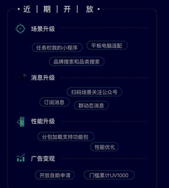 - 场景晋级,新增“任务栏我的小程序”、“品牌查找和品类查找”、“APP 翻开小程序”和“平板电脑适配”等功用。(近期已上线)